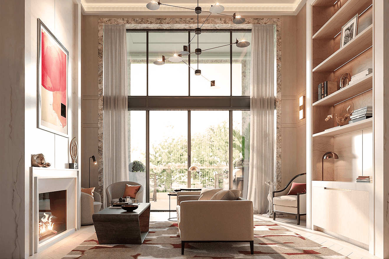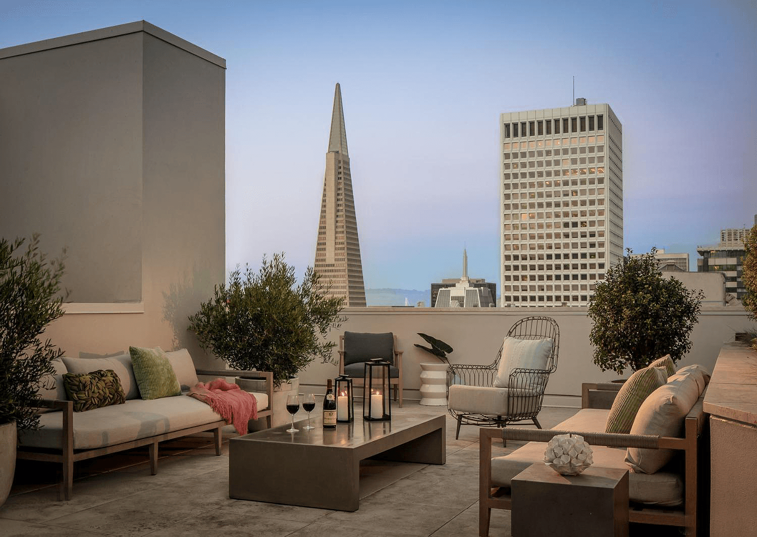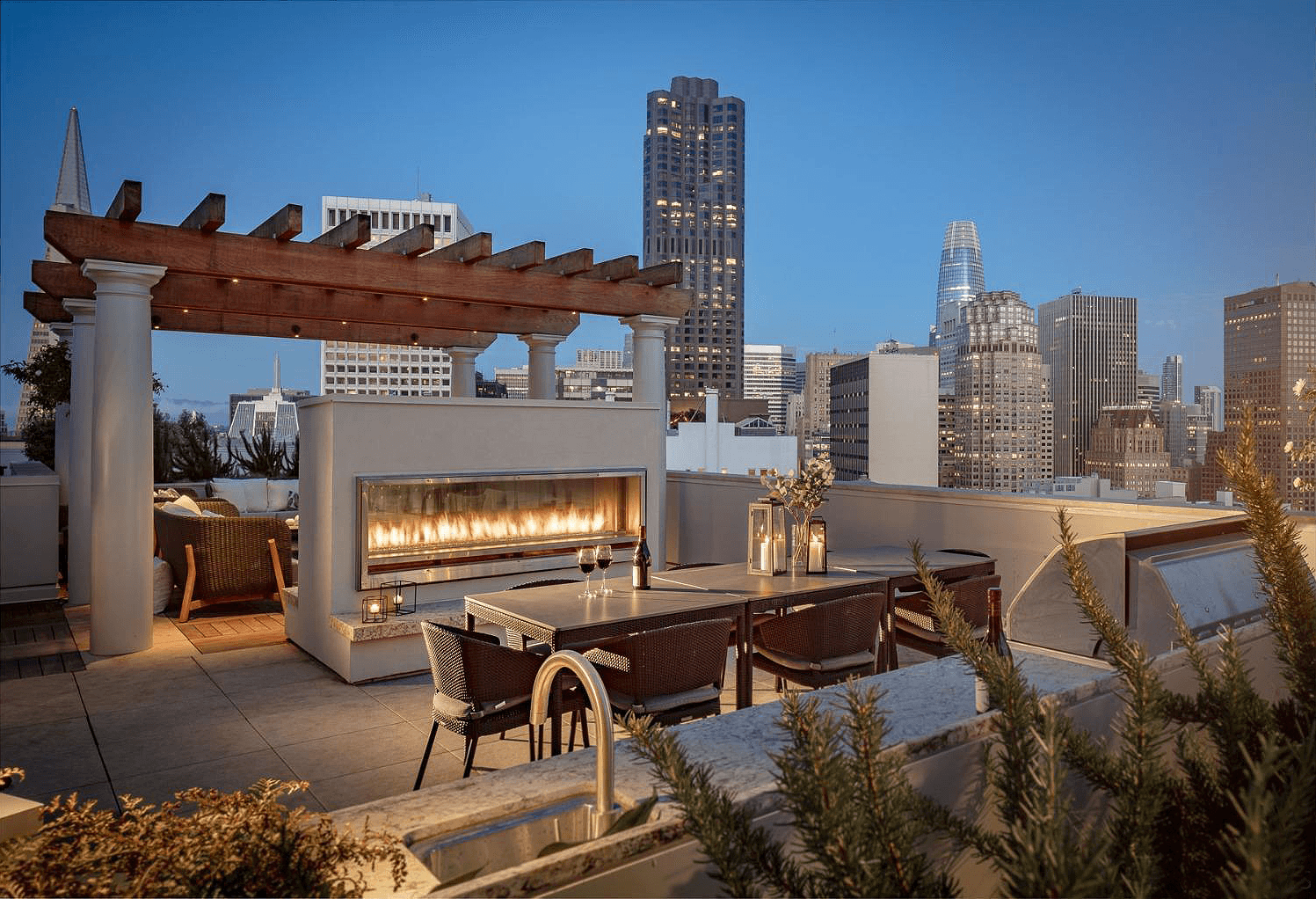 Amenities at Crescent include an intimate library with warm fireplace, a terraced outdoor garden, a fitness center and spa, and a rooftop open-air lounge with breathtaking views across the city and bay.