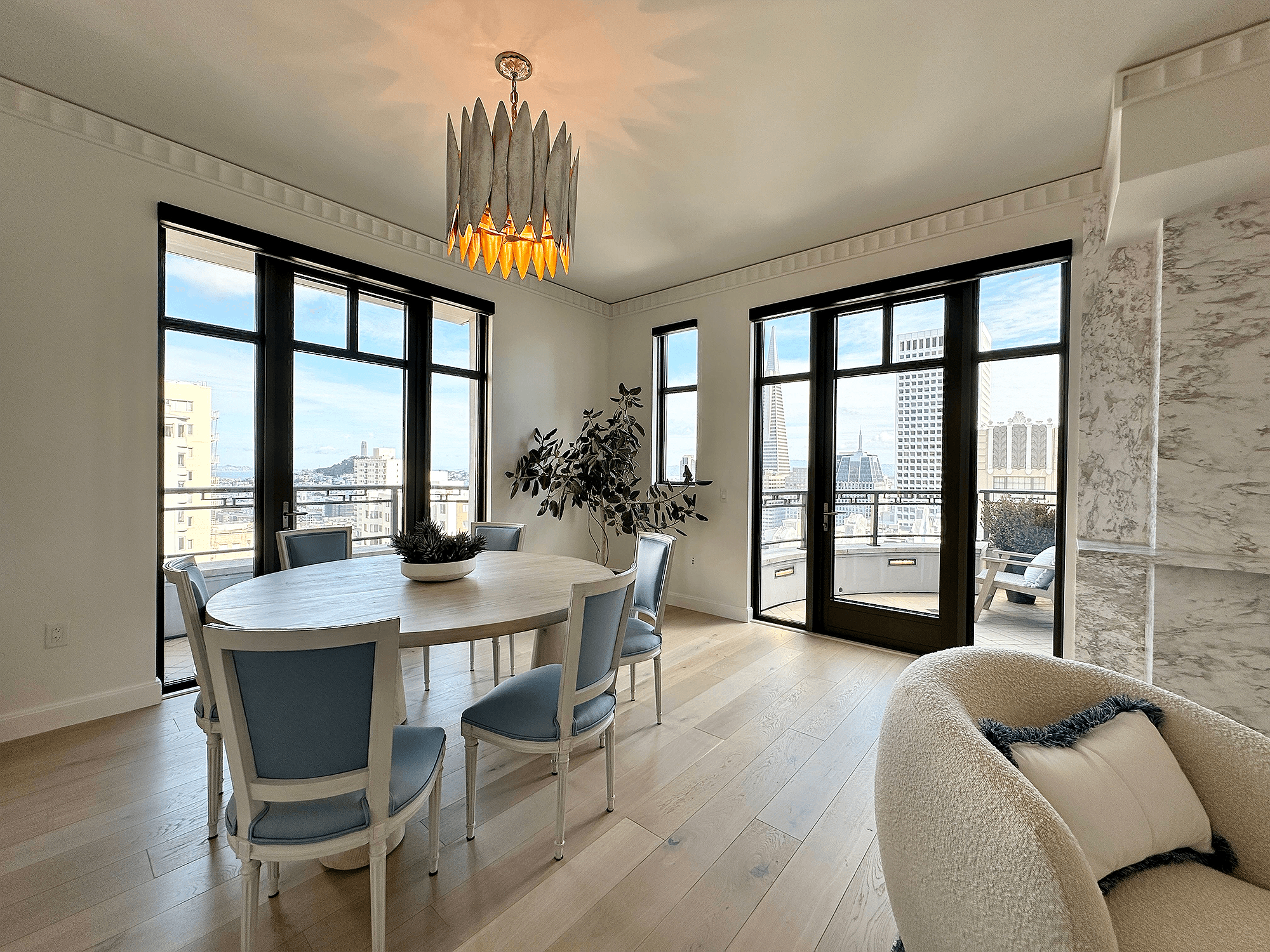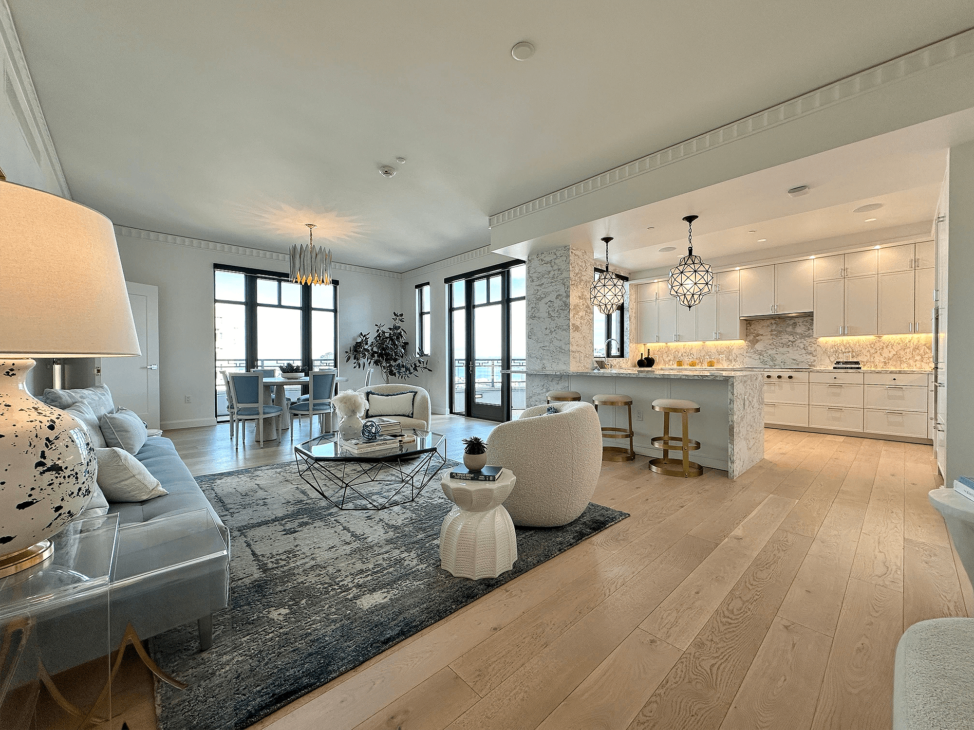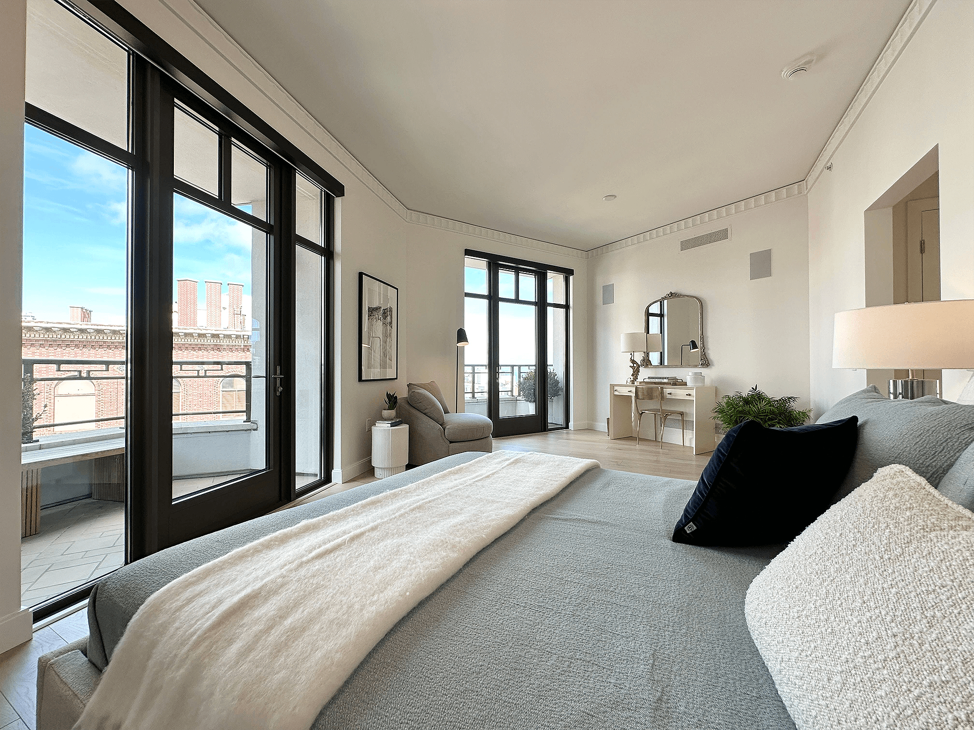 Inspired by the distinct styling of art deco, this penthouse offers high ceilings, custom moldings and detailing, and multiple outdoor terraces. The primary suite has a generously-sized bath with dual vanity, separate shower and soaking tub.